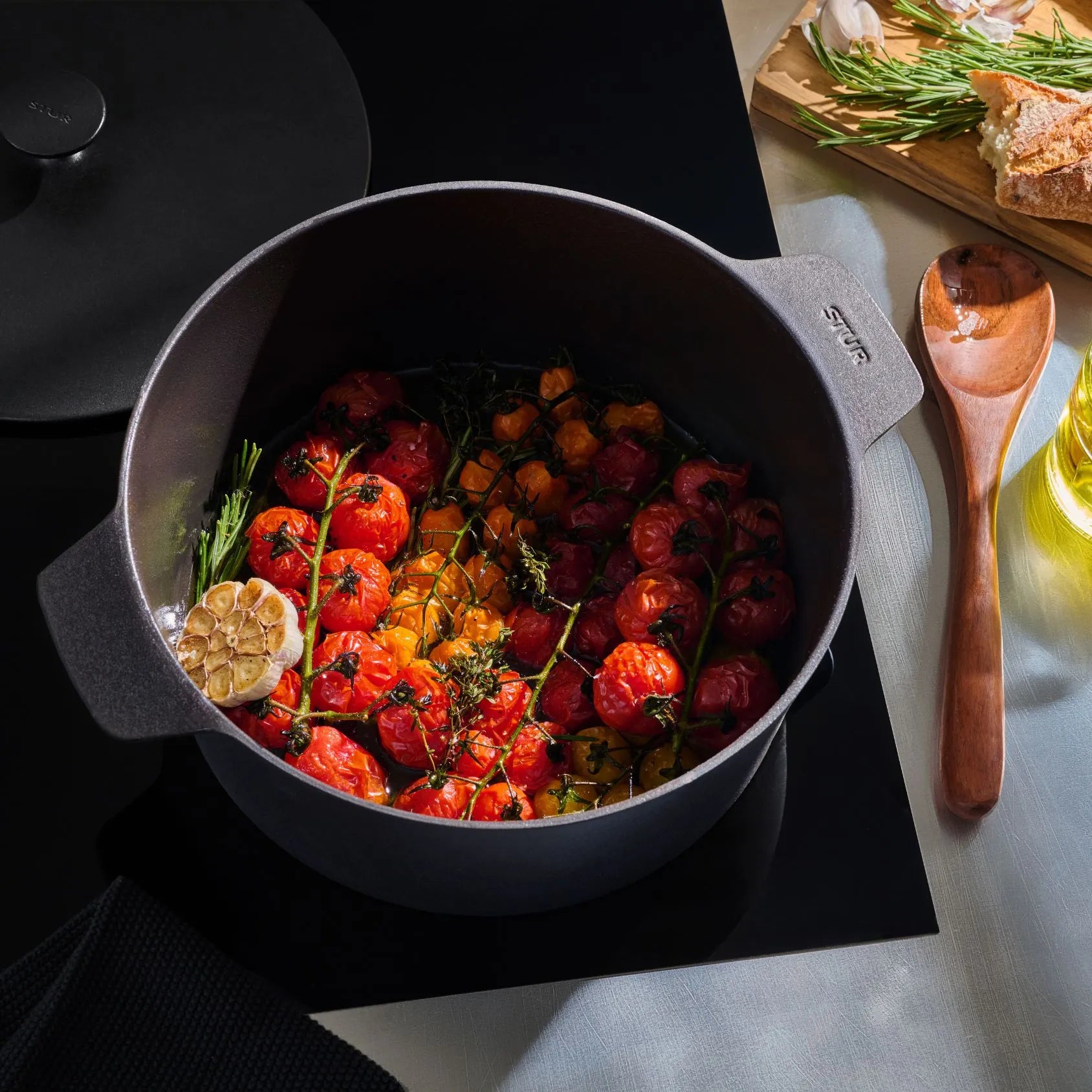 Unser STUR Bräter funktioniert im Alltag genauso gut wie zu besonderen Anlässen: zum Brotbacken, zum Schmoren, für Pasta, Eintöpfe, Currys oder One-Pot-Gerichte.