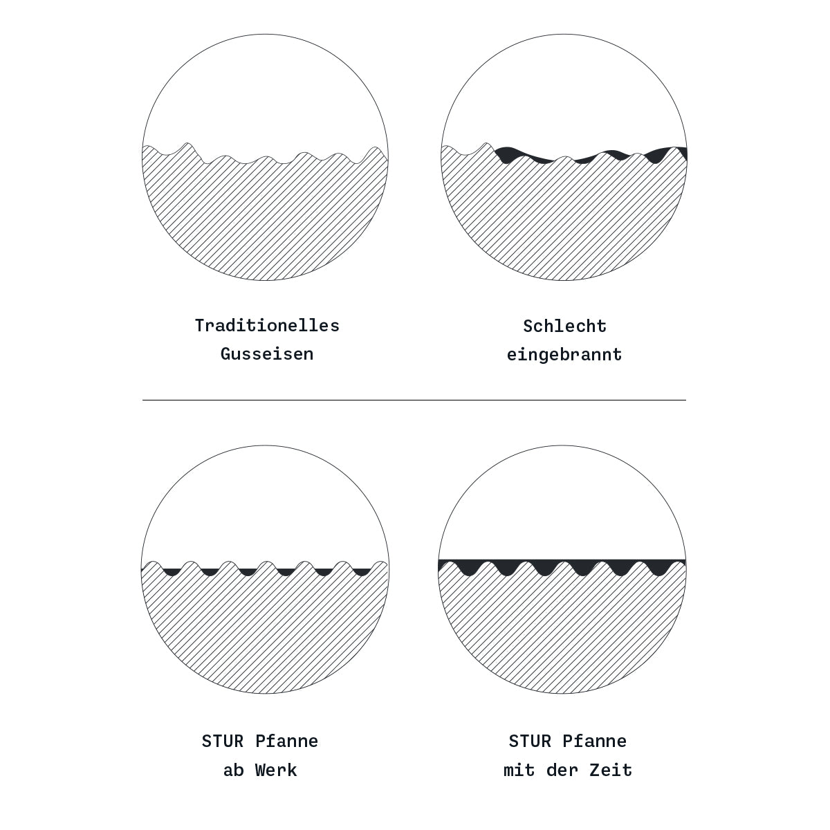 Jede STUR Pfanne wird ab Werk mit einer Schicht aus pflanzlichem Öl eingebrannt, sodass sie sofort einsatzbereit ist – und mit jedem Gebrauch noch besser wird.