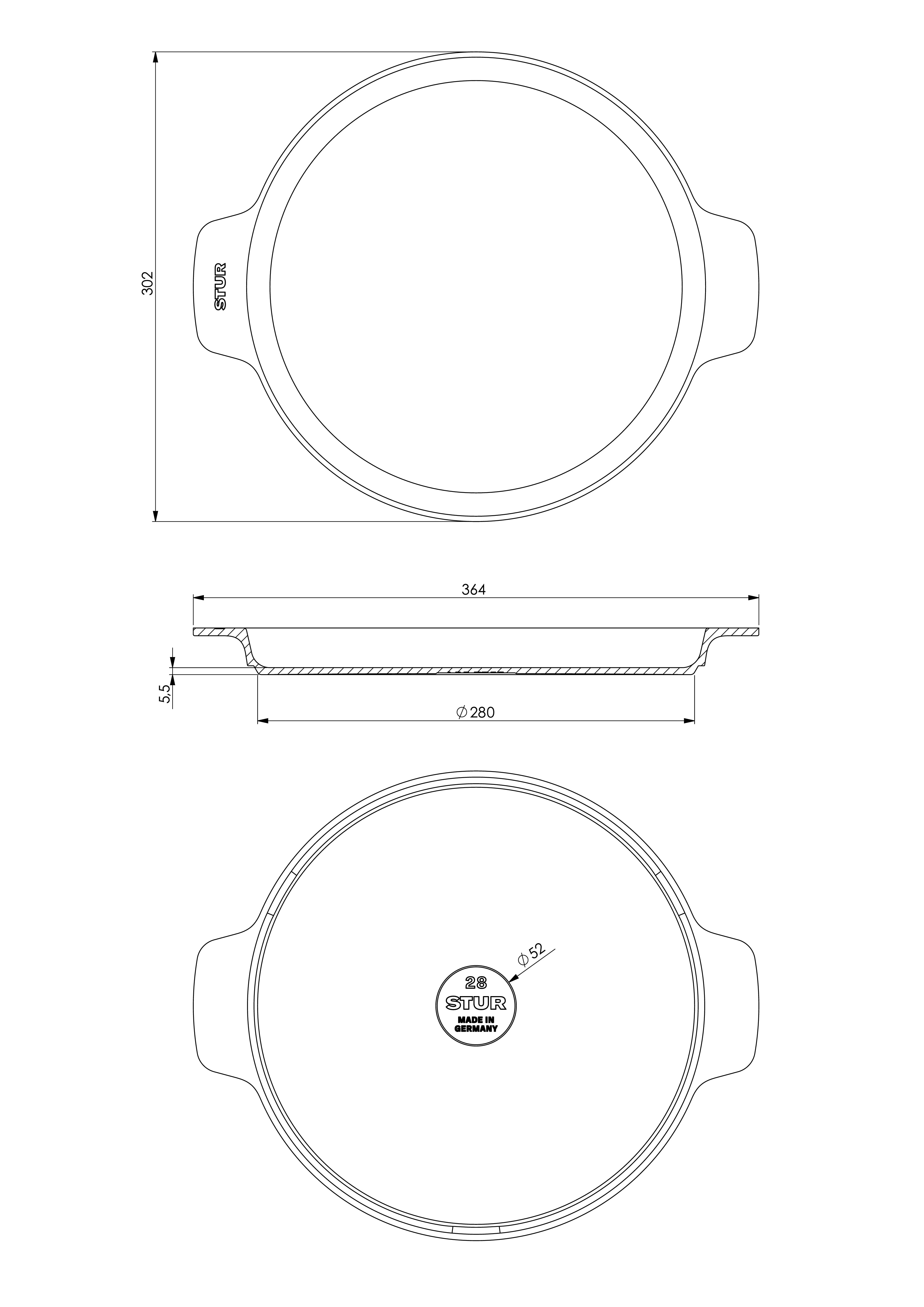 - Pfannenmaße (L x B x H): 36,4 x 30,2 x 3,1 cm