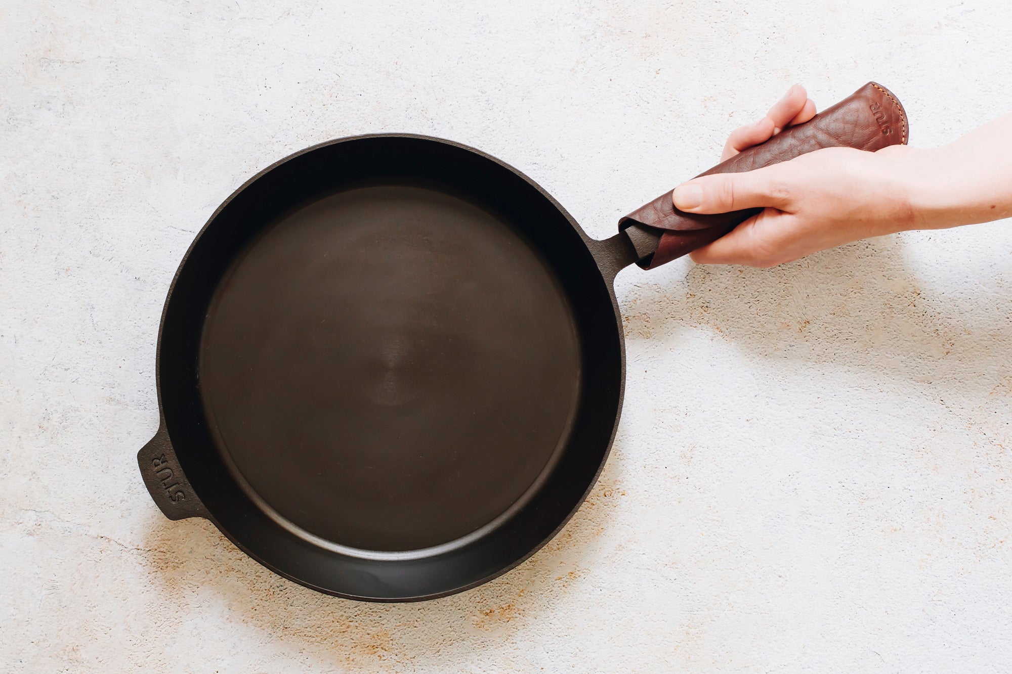 Unser Leder-Griffschutz schützt deine Hände beim Einsatz auf dem Herd.