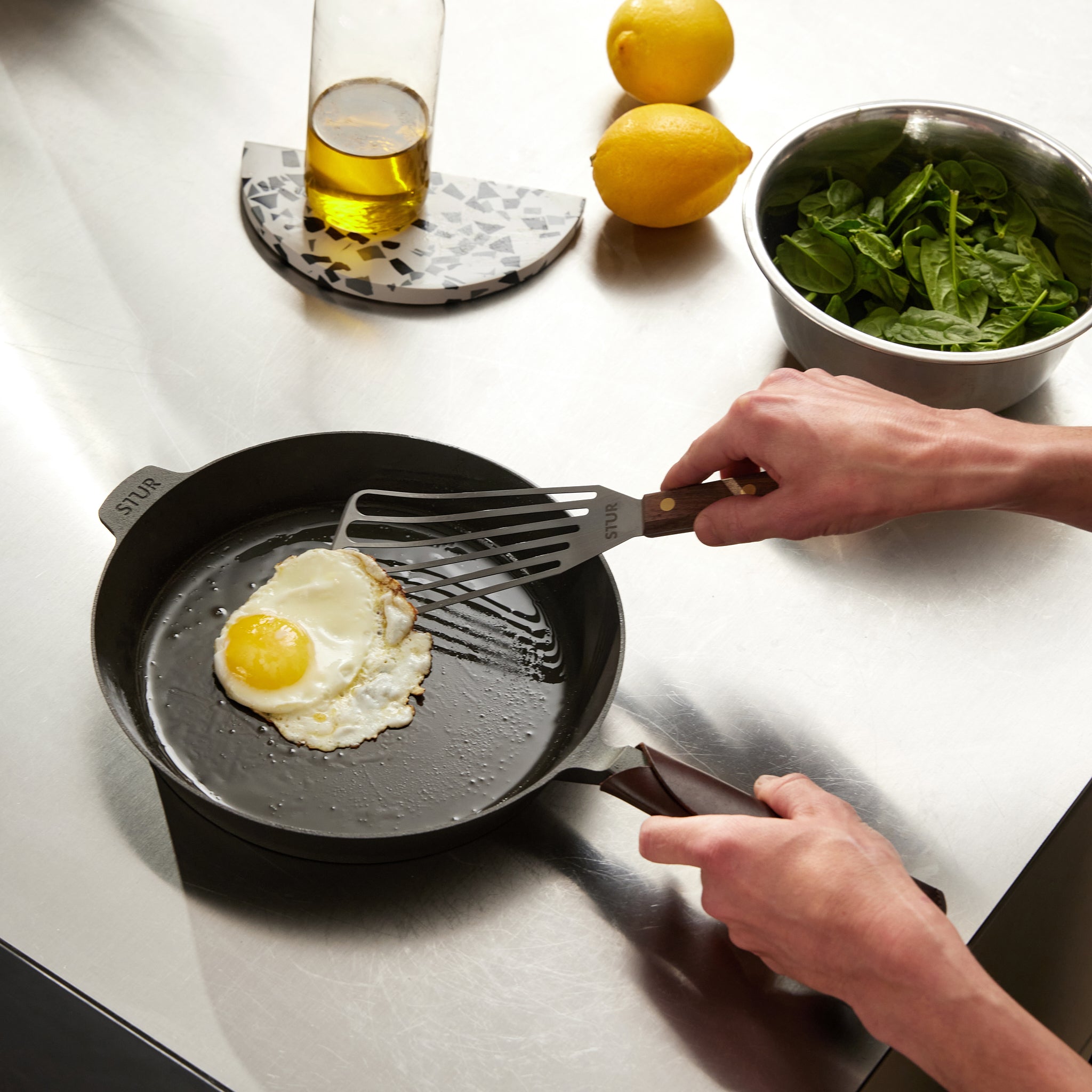 Jede STUR Pfanne wird ab Werk mit einer Schicht aus pflanzlichem Öl eingebrannt, sodass sie sofort einsatzbereit ist – und mit jedem Gebrauch noch besser wird.